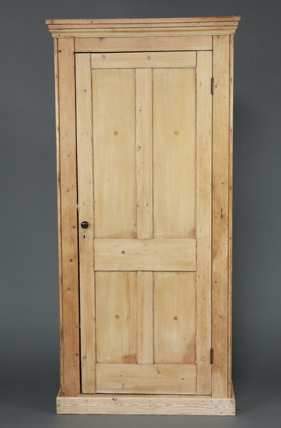 A Victorian pine wardrobe with moulded cornice, fitted a shelf and hanging space above a recess, enclosed by a panelled door, raised on a platform base 209cm h x 99cm w x 51cm d (in one section)