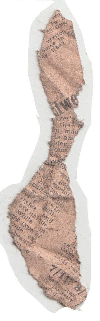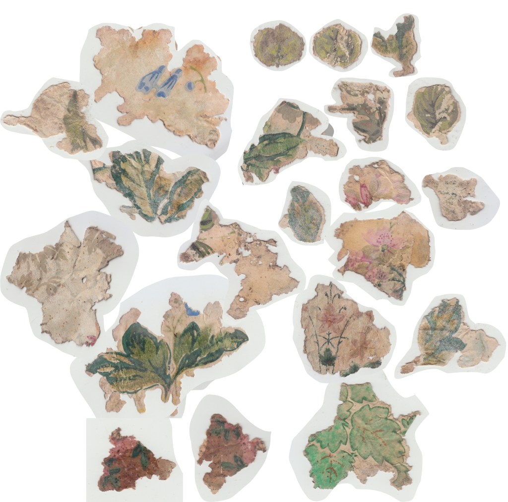 These fragments found under smaller bedroom (east). near the hallway. some of the images could also be from scrapbooking or print illustrations and at least one newspaper fragment found under smaller bedroom floorboards. nothing printed on the reverse and some fragments had wallpaper layers underneath them.
