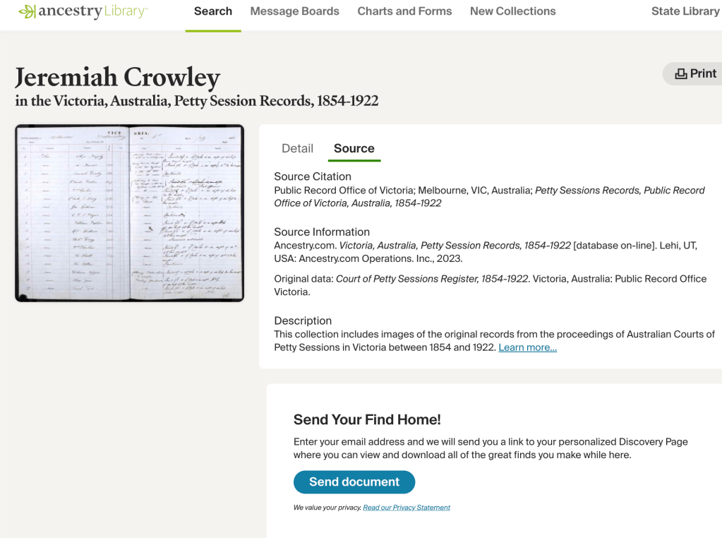 Ancestry.com. Victoria, Australia, Petty Session Records, 1854-1922 [database on-line]. Lehi, UT, USA: Ancestry.com Operations. Inc., 2023.