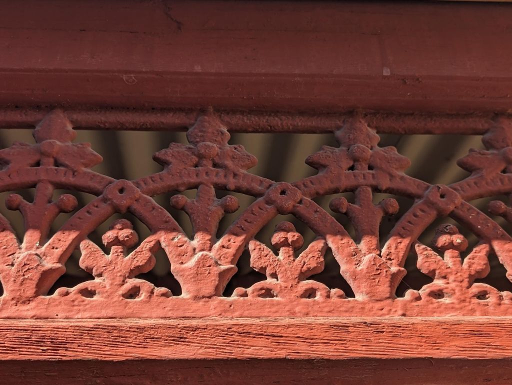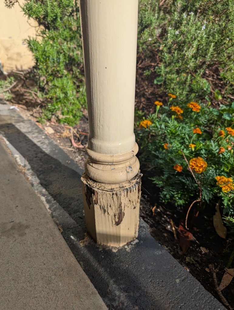 Severe wet rot decay is present to the front verandah roof pitching beam. Posts are also decay. Decayed timbers need replacement by a carpenter to assure this verandah remains secure.