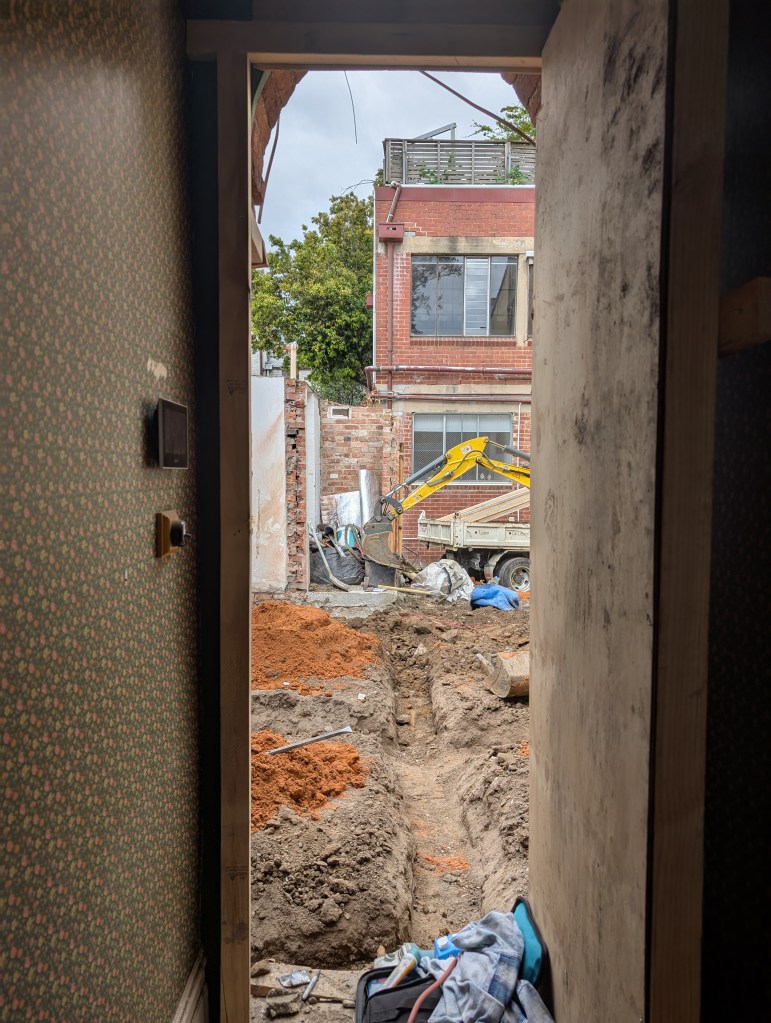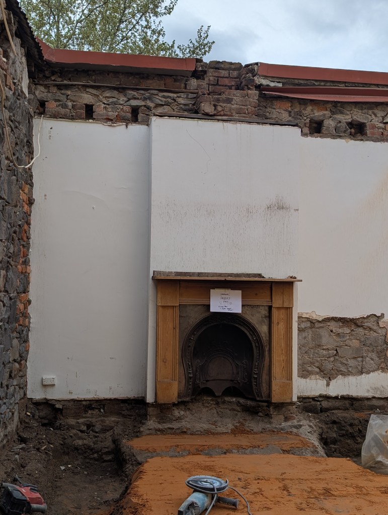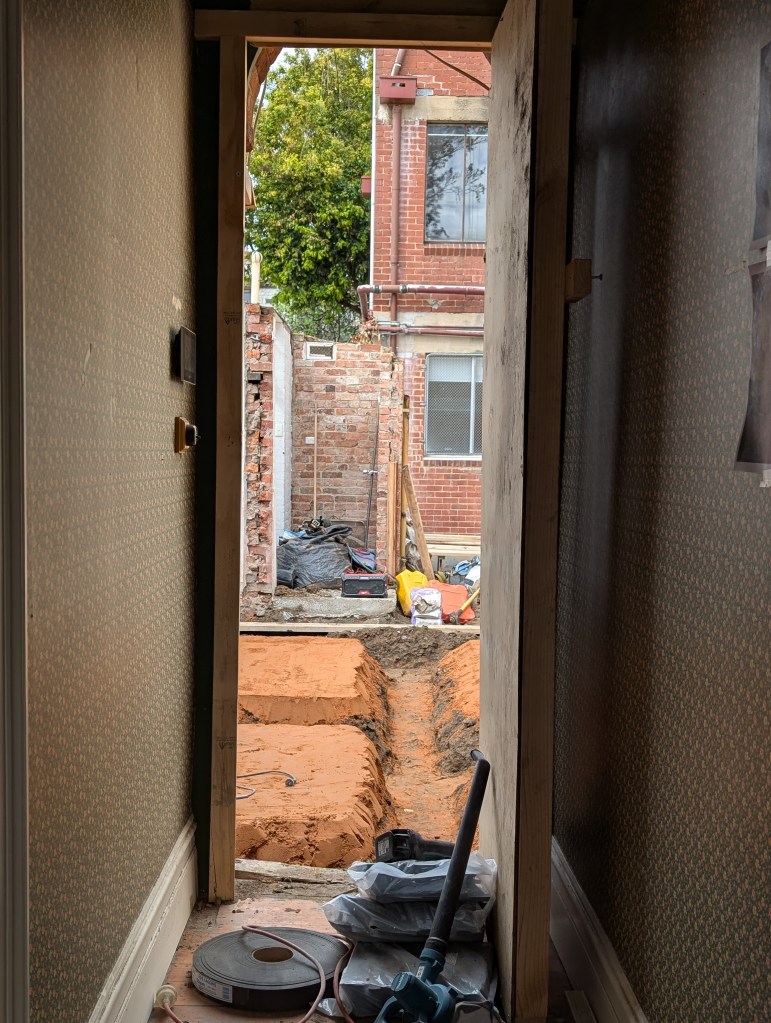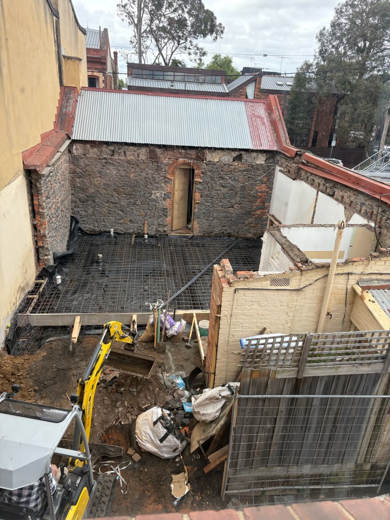 the depth of the trenches create the footings of the single concrete slab pour (i did not know that). (science).fireplace and it’s immediate tiling being kept & protected but it’s so firmly in place it was possible to rip out tiling from under it