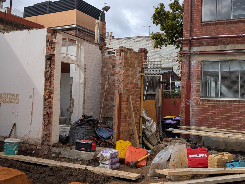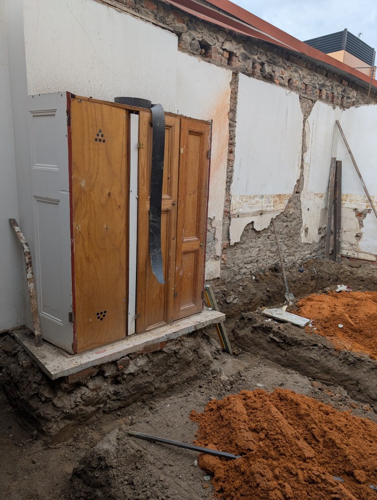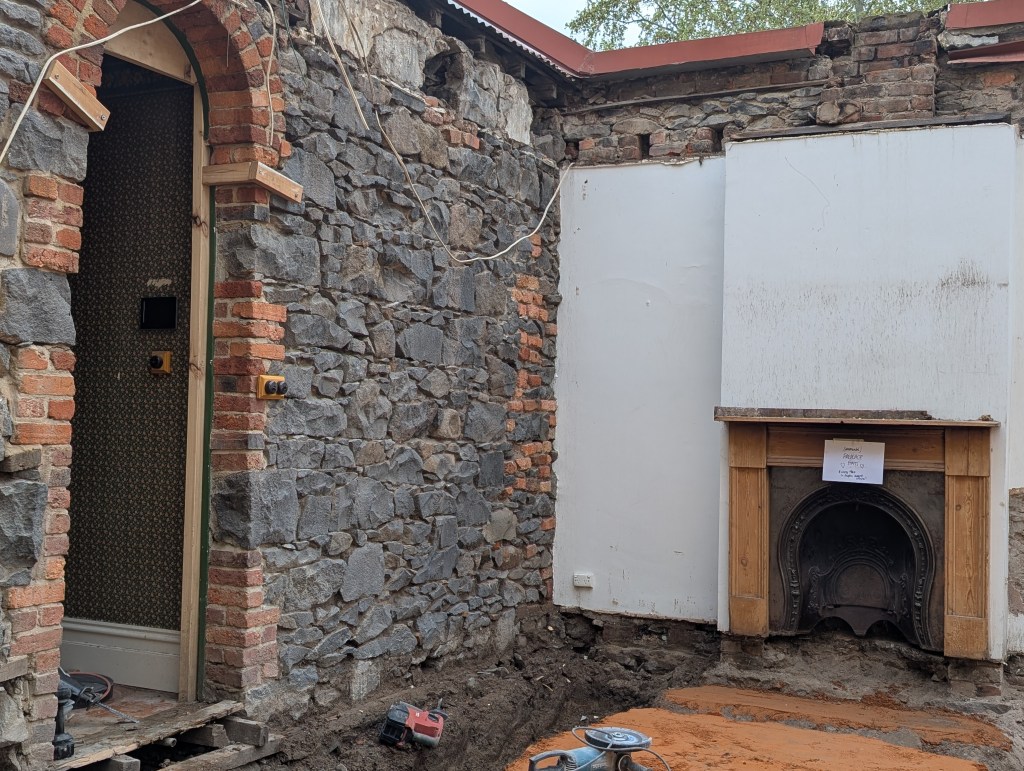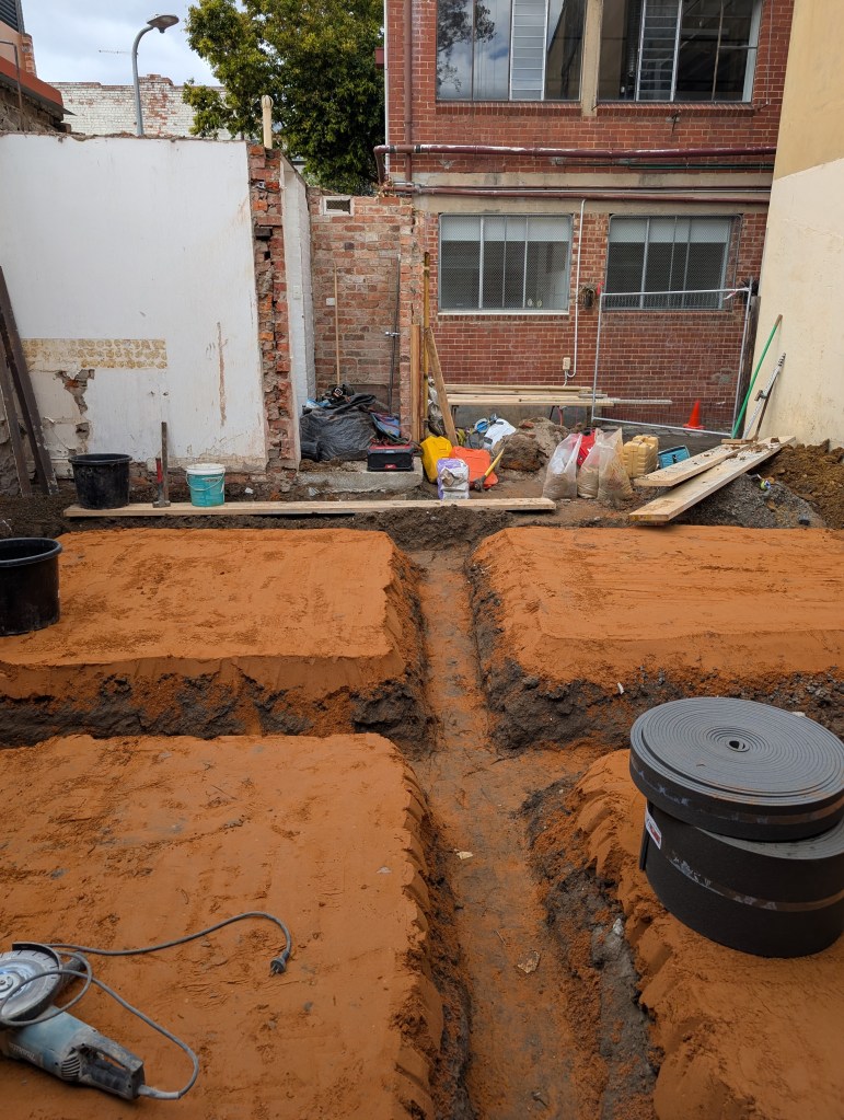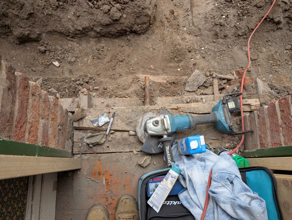 the depth of the trenches create the footings of the single concrete slab pour (i did not know that). (science).fireplace and it’s immediate tiling being kept & protected but it’s so firmly in place it was possible to rip out tiling from under it
