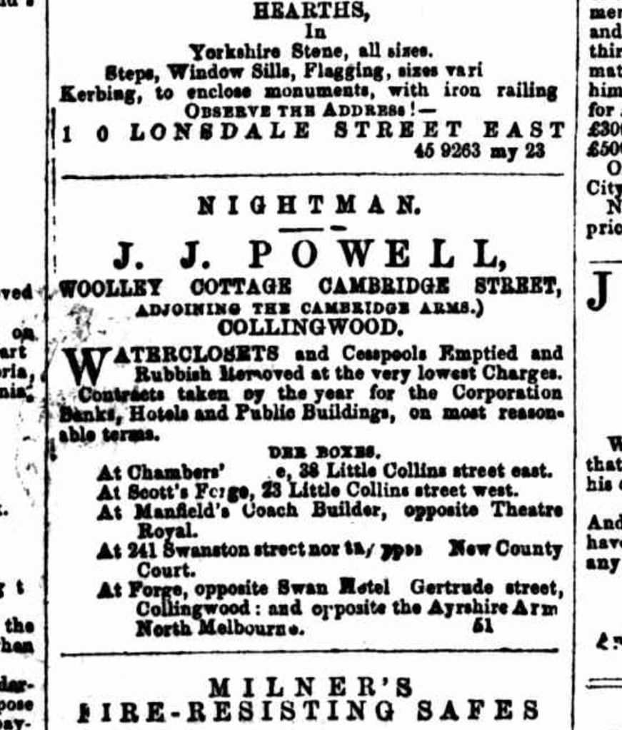 Here’s an ad for the local night soil man11 who would have been collecting contents from said chamber pot from Gertrude St.
