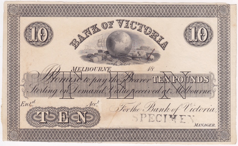 Bank Of Victoria (Melbourne) Ca 1853 10 Pounds Unissued Printer’s Proof MVR# 1 About Unc SOURCE STERLING AND CURRENCY