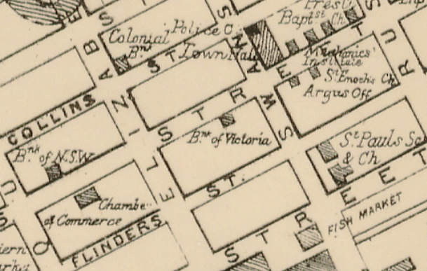 *Collins Street had two sets of numbers, east and west of Elizabeth Street. James Reid, to the left of the bank building in the photograph is no.64 Collins Street West.