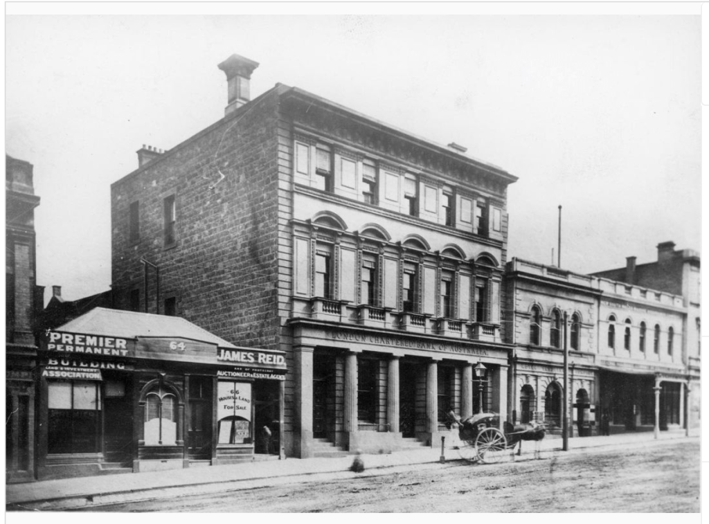 C1887 The London Chartered Bank of Australia, Collins Street West, Melbourne. by Albert Charles Cooke (1836 – 1902) source https://antiqueprintmaproom.com/product/the-london-chartered-bank-of-australia-collins-st-albert-charles-cooke/