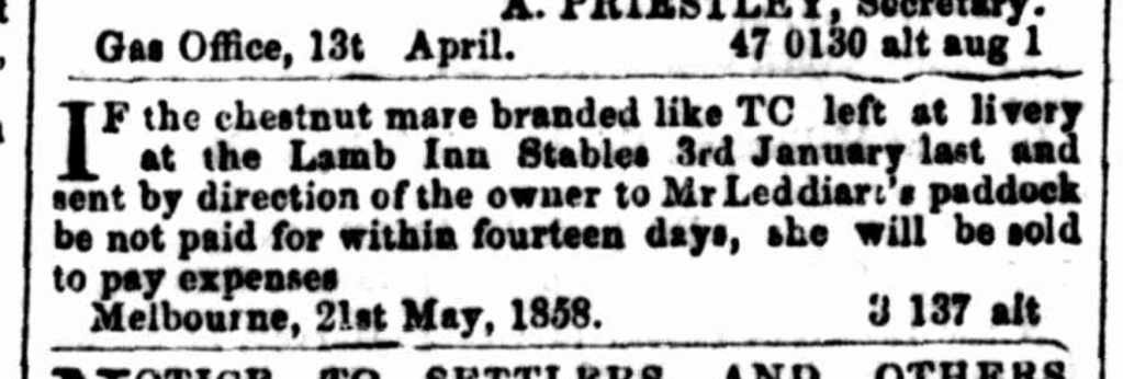 IF the chestnut mare branded like TC left at livery at the Lamb Inn Stables 3rd January last and sent by direction of the owner to Mr Leddiart’s paddock be not paid for within fourteen days, she will be sold to pay expenses.