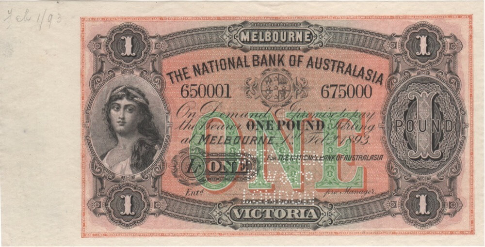 National Bank Of Australasia (Melbourne) 1893 One Pound Unissued Specimen Note MVR# 4m Uncirculated This attractive specimen was prepared just a few months before the 1893 banking depression….The notes of the NBA differ by state – while the designs remain largely the same regardless of which colony or state the note was issued in, each different state was identified not only by a notation of the domicile (either by the state or city of issue), but also by a different female figure personifying that state. SOURCE: STERLING AND CURRENCY https://www.sterlingcurrency.com.au/national-bank-of-australasia-melbourne-1893-one-po