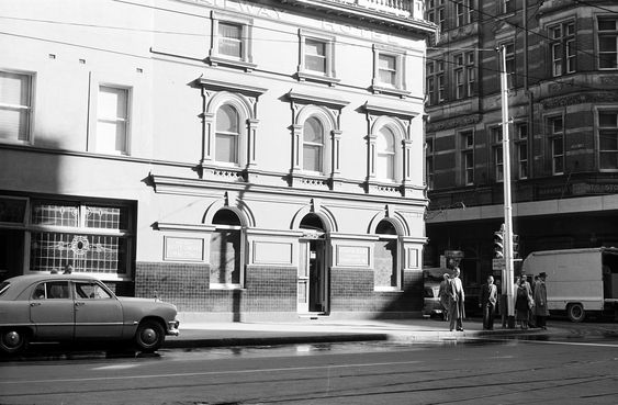 Johnny Connell’s Railway Hotel, Elizabeth StJohnny Connell’s Railway Hotel, South-West cnr Elizabeth St and Flinders Lane, circa 1959. A hotel has traded on this site since as early as 1838, but not known by this name until the mid-1850s. Greatly enlarged & remodeled sometime late 19th C. Demolished c.1960 for ANZ Bank Offices, but continued trading as a basement bar. Today a backpackers.