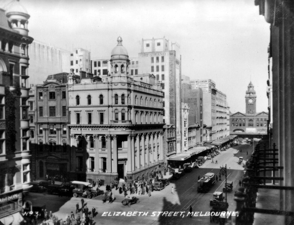 The balcony of the Hotel London commands a fine view of Elizabeth Street, in this 1936 photograph. It looks southeast along Elizabeth Street towards its intersection with Collins Street, and beyond. Domed towers are seen atop Altsons Corner (left), the ES&A Royal Bank Branch (centre), and on Flinders Street Station (right) that closes the vista along Elizabeth Street. The Hotel London no longer exists, but its building still graces this part of Elizabeth Street.